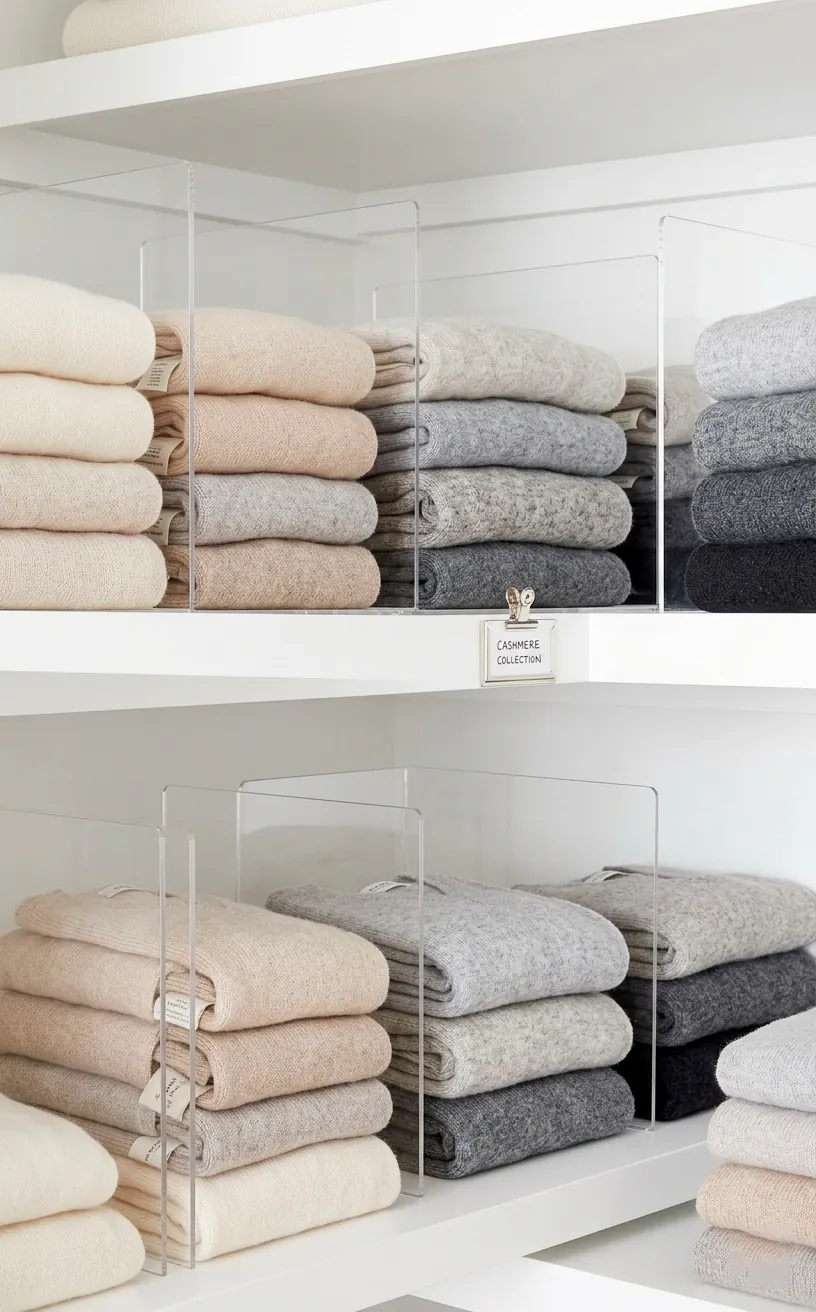 Folded stacks of sweaters have a nasty habit of leaning over like the Tower of Pisa. IMO, acrylic dividers are the unsung heroes of closet organization. They keep your stacks vertical and virtually invisible, so the focus stays on your clothes.