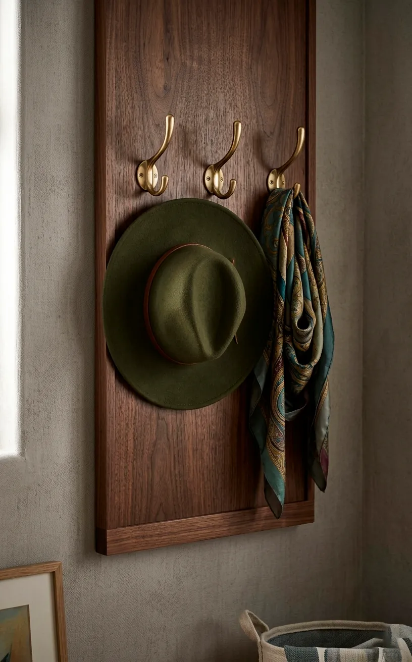 Hats and scarves often end up in a tangled heap. I installed a few high-quality brass hooks on the side panels of my closet. It utilizes dead space and turns your accessories into part of the decor.