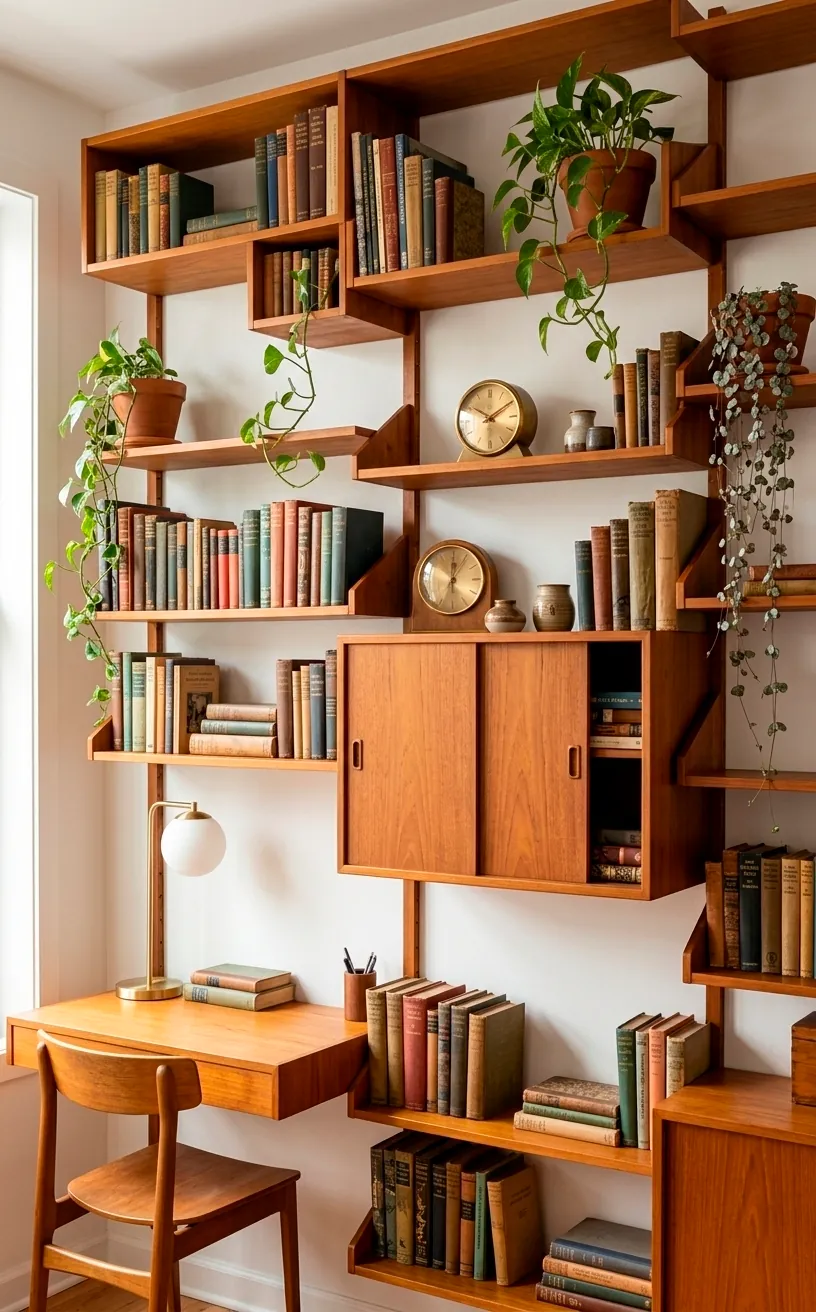 Floor space is a precious commodity, so why not use your walls? The teak wall system is the ultimate flex for anyone with a book collection or a penchant for displaying ceramics.