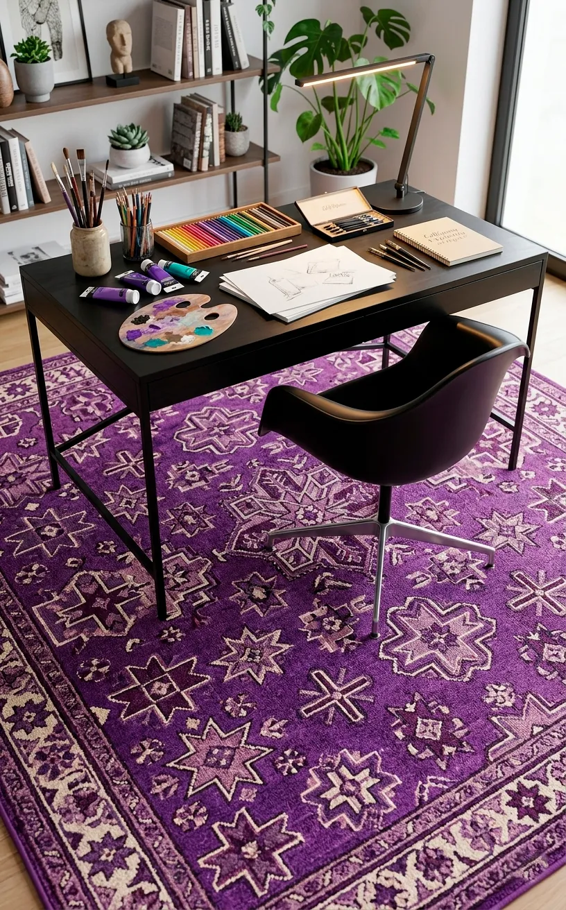 Purple usually scares people off, but an Amethyst Kilim is surprisingly versatile. Think of it as a neutral with a spicy personality. The mosaic patterns often found in these rugs break up the intensity of the purple, making it feel grounded rather than overwhelming.