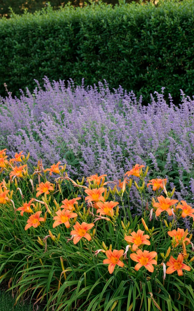 Looking for some serious visual tension? I combine “hot” colors like orange lilies with “cool” purples like Russian Sage. This high-contrast pairing makes every flower stand out against its neighbor. I find that this combination looks particularly stunning during the “golden hour” before sunset. Ever noticed how purple looks even deeper next to bright orange? It is a total game-changer for your curb appeal.