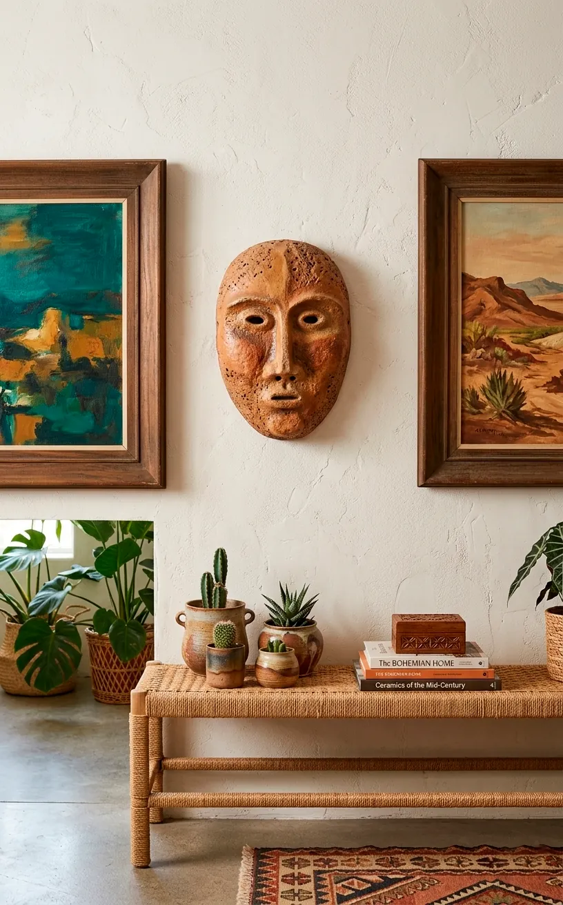 Let’s add some 3D drama. Ceramic wall masks or sculptural tiles break the monotony of square frames and give your eyes something tactile to rest on. I love finding mid-century stoneware pieces with earthy glazes because they add a ‘hand-made’ soul to the display. Why keep your walls flat and boring when they could be literally sticking out at you? Grab something weird, something heavy, and something that makes you smile every time you walk past it.
