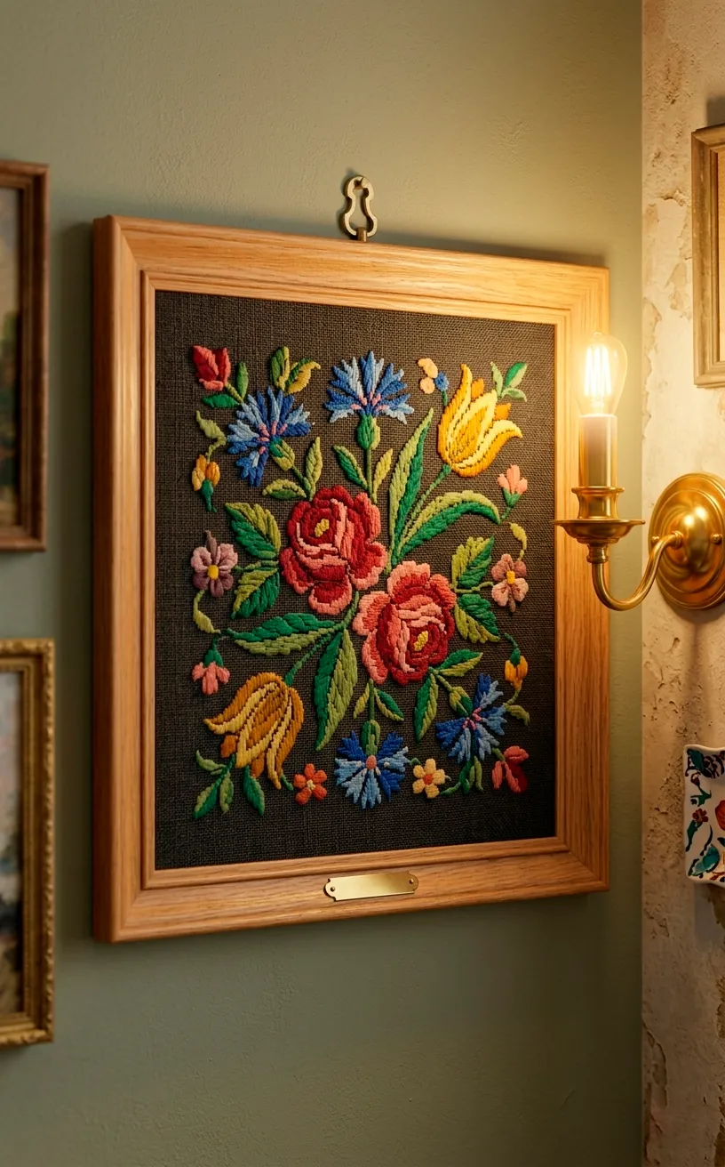 Sometimes a wall feels too ‘hard’ with all that glass and wood. Enter the vintage textile or needlepoint. A small, framed piece of embroidery or a tiny woven tapestry adds a soft, organic texture that balances out the shiny brass and gold.