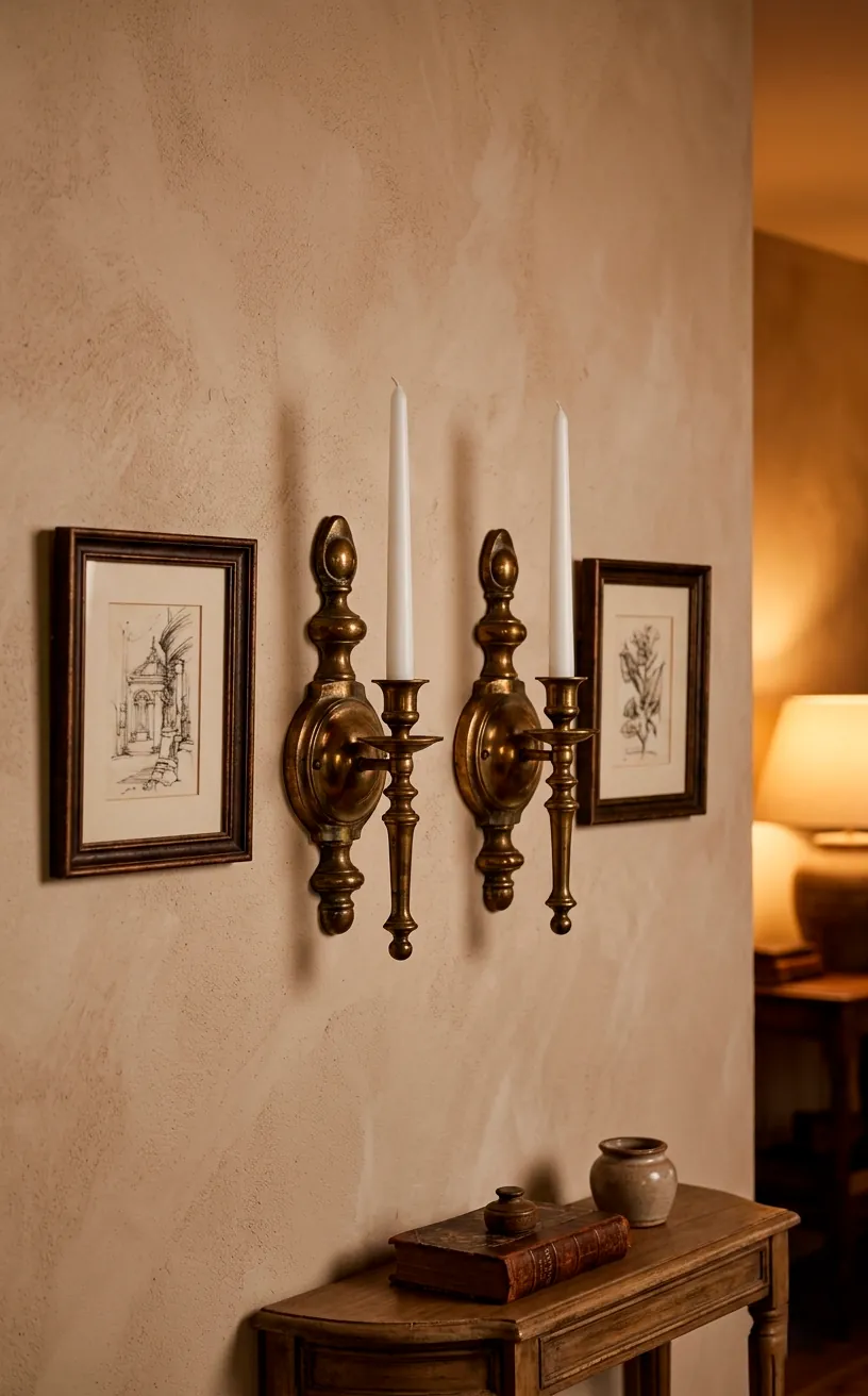 Next up, let’s talk about the glow factor. Vintage brass candle sconces act like the ultimate mood lighting for your gallery wall. They break up the flatness of 2D frames and introduce a lovely metallic warmth that reflects light beautifully during your evening glass of wine.