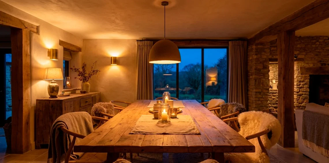 Wall sconces are the unsung heroes of cozy lighting because they bounce light off the walls rather than beaming it straight down. This ‘wall washing’ technique makes a room feel wider and much more architectural. I love using brass or matte black sconces to add a bit of jewelry to the walls while providing that crucial secondary layer of light. They create a beautiful rhythm around the room, especially if you place them in pairs. Why leave your walls in the dark when they could be glowing? It’s a simple trick that adds a ton of sophistication to any dinner party vibe.