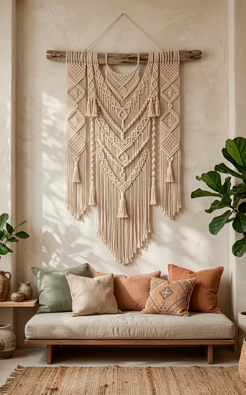Your walls should tell a story, not just hold up the ceiling. A massive macramé wall hanging serves as the perfect soft headboard for a nook. It absorbs sound, making your reading time even quieter.