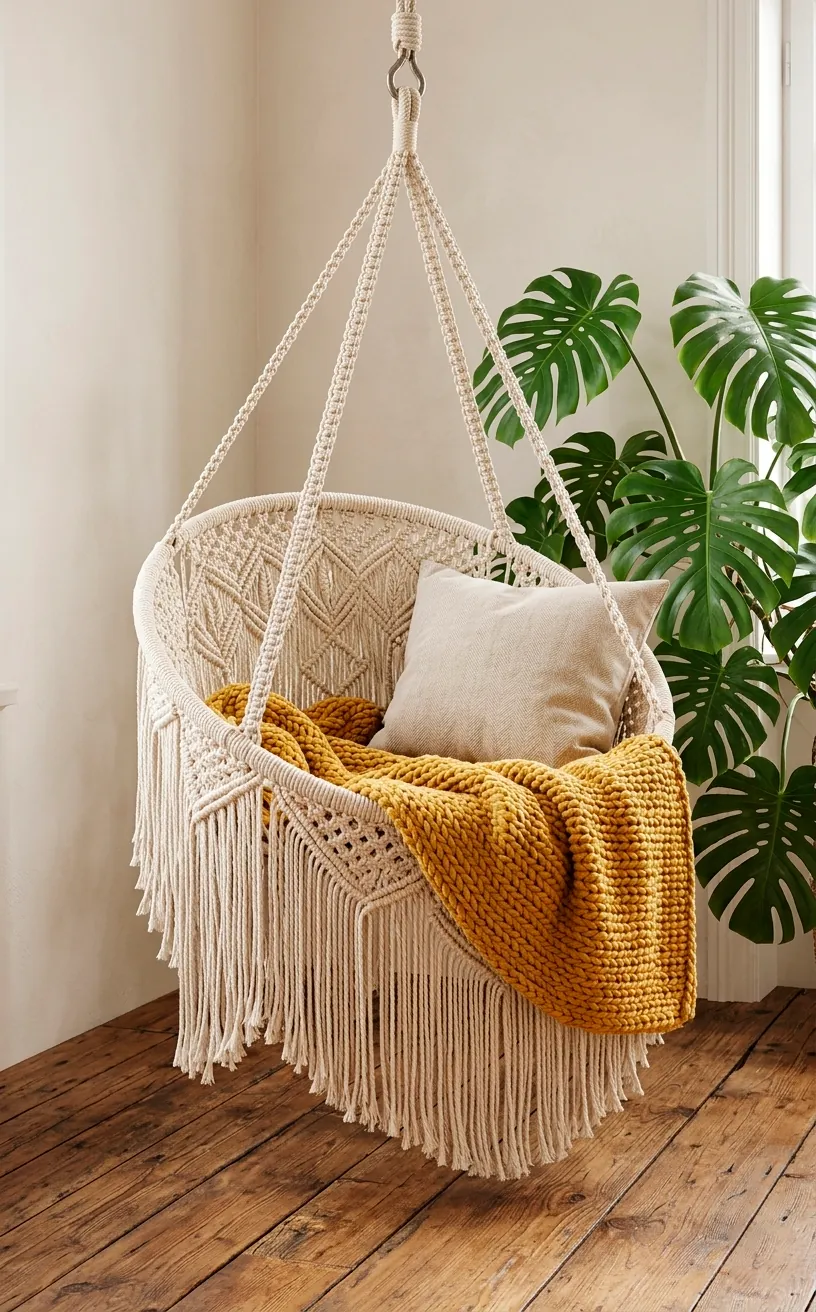 Does your ceiling look strong enough to hold your weekend reading marathons? Make sure you choose a chair with a heavy-duty cotton weave to avoid that annoying sagging feeling. This setup instantly turns a dead corner into a high-end retreat that looks like it belongs in a magazine. Seriously, your cat will probably try to claim it before you even sit down.