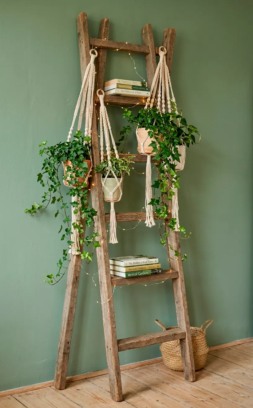 Don’t throw away that old wooden ladder! Lean it against the wall and drape macramé plant hangers from the rungs. It creates a vertical garden that doubles as a bookshelf for your current reads.