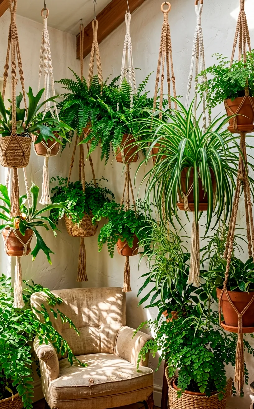 Mixing different rope colors—like cream, sage, and rust—adds even more depth to the greenery. Just remember to check the light requirements for your plants so they don’t get grumpy in a dark corner. FYI, pothos and snake plants are basically indestructible for this.
