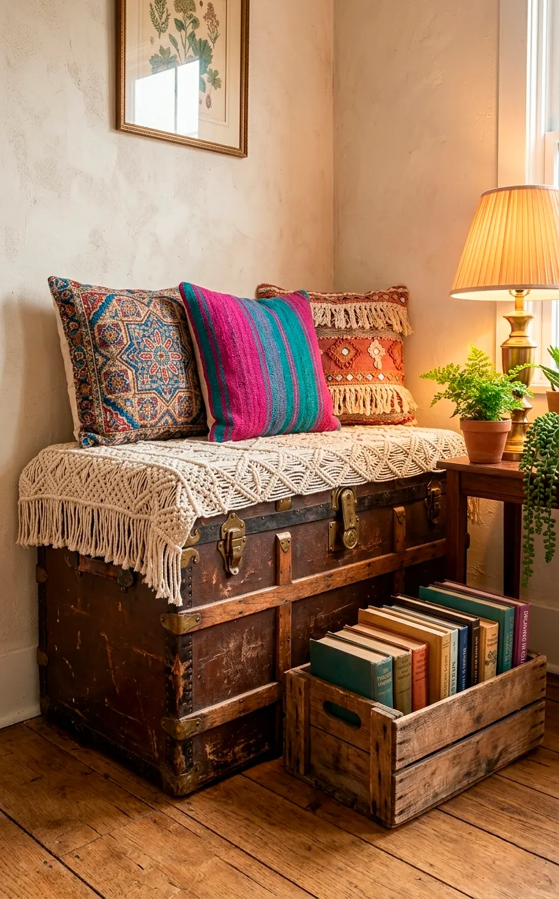 I personally use a trunk I found at a flea market, and it’s the sturdiest seat in the house. Adding a macramé runner over the top softens the hard edges of the wood or metal, making it look intentional rather than just a storage box.