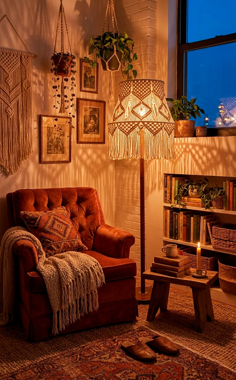 Lighting sets the mood, people! A harsh overhead light will kill the boho vibe faster than a cold cup of tea. Instead, use a macramé lampshade on a floor lamp or a pendant light.