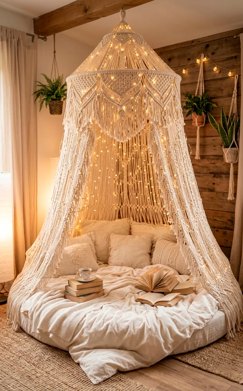 For the ultimate escape, hang a macramé canopy from the ceiling over a pile of pillows. It creates a “room within a room” feel that is perfect for deep focus.