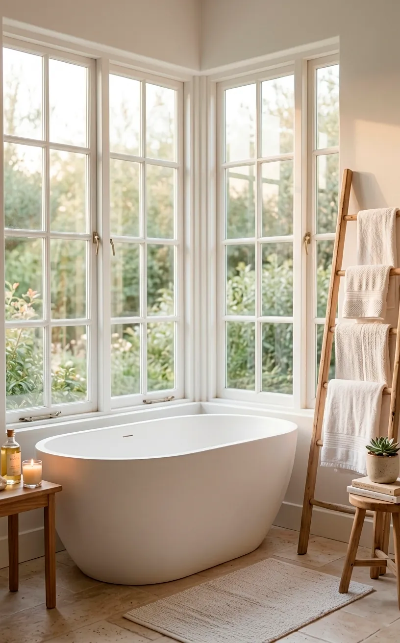 Don’t forget the textures! A small wooden stool next to the tub provides a spot for your tea (or wine, no judgment) and adds that essential ‘hygge’ warmth. I find that placing a tub diagonally can sometimes soften the harsh lines of a rectangular room.