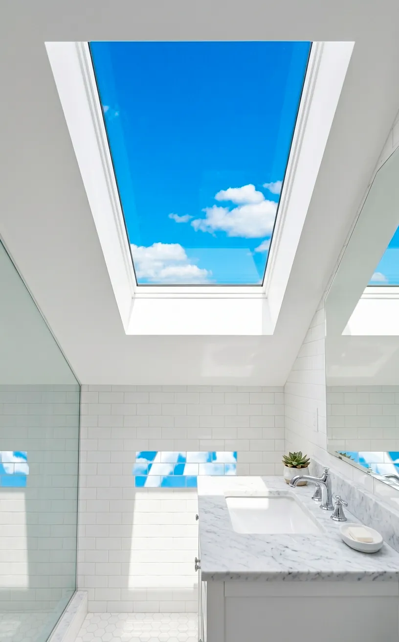 Nothing beats natural sunlight for creating an airy vibe. If you’re on the top floor, I highly suggest installing a skylight directly over the vanity or the shower. It’s a total game-changer for people like me who hate getting ready in a windowless box. The vertical light makes white surfaces glow and prevents the space from feeling clinical. I’ve seen this work beautifully with high-gloss white tiles that reflect the sky’s brightness throughout the day. You’ll save on the electricity bill, and honestly, seeing the clouds while you’re washing your face is a vibe you didn’t know you needed. It transforms the room from a utility space into a literal sunroom for your soul.