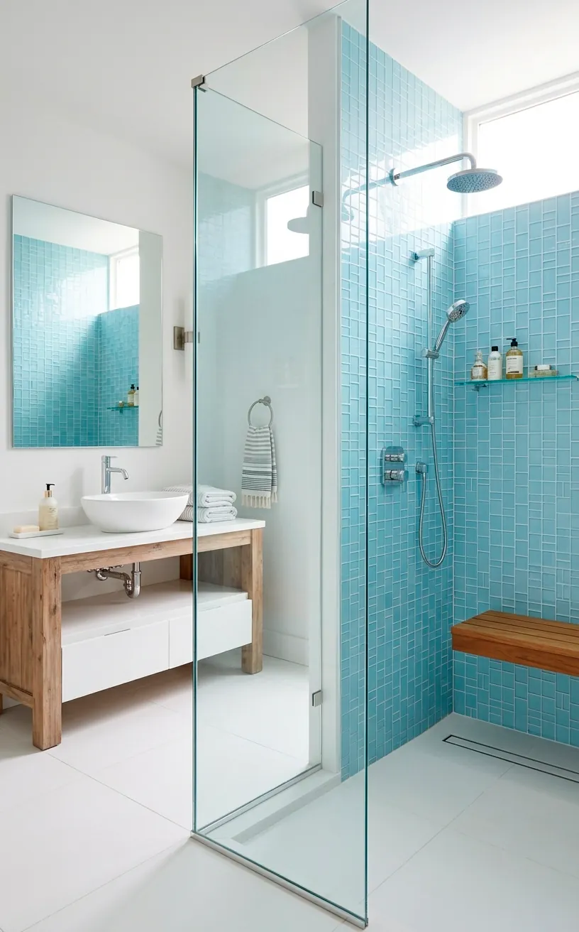 Want a pro tip? Use a single fixed panel instead of a door. It’s fewer hinges to clean and creates a much more open flow. If you’re worried about it feeling too cold, check out these airy blue and white coastal bathroom schemes for ways to soften the palette.