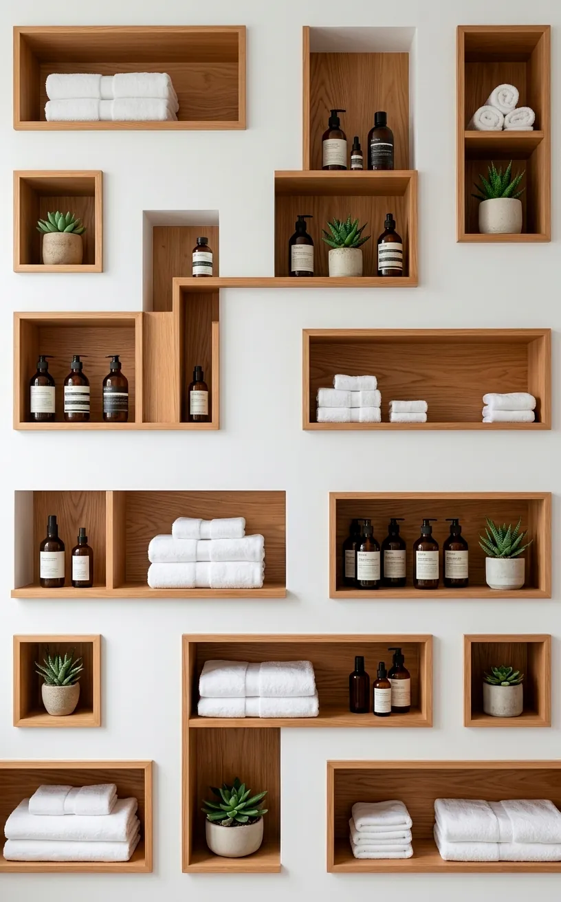 Bulky medicine cabinets are the enemies of an airy room. Instead, I love using recessed open shelving with asymmetrical layouts. It provides storage without protruding into your precious walking space. Plus, it gives you a chance to curate your favorite products like a mini art gallery.