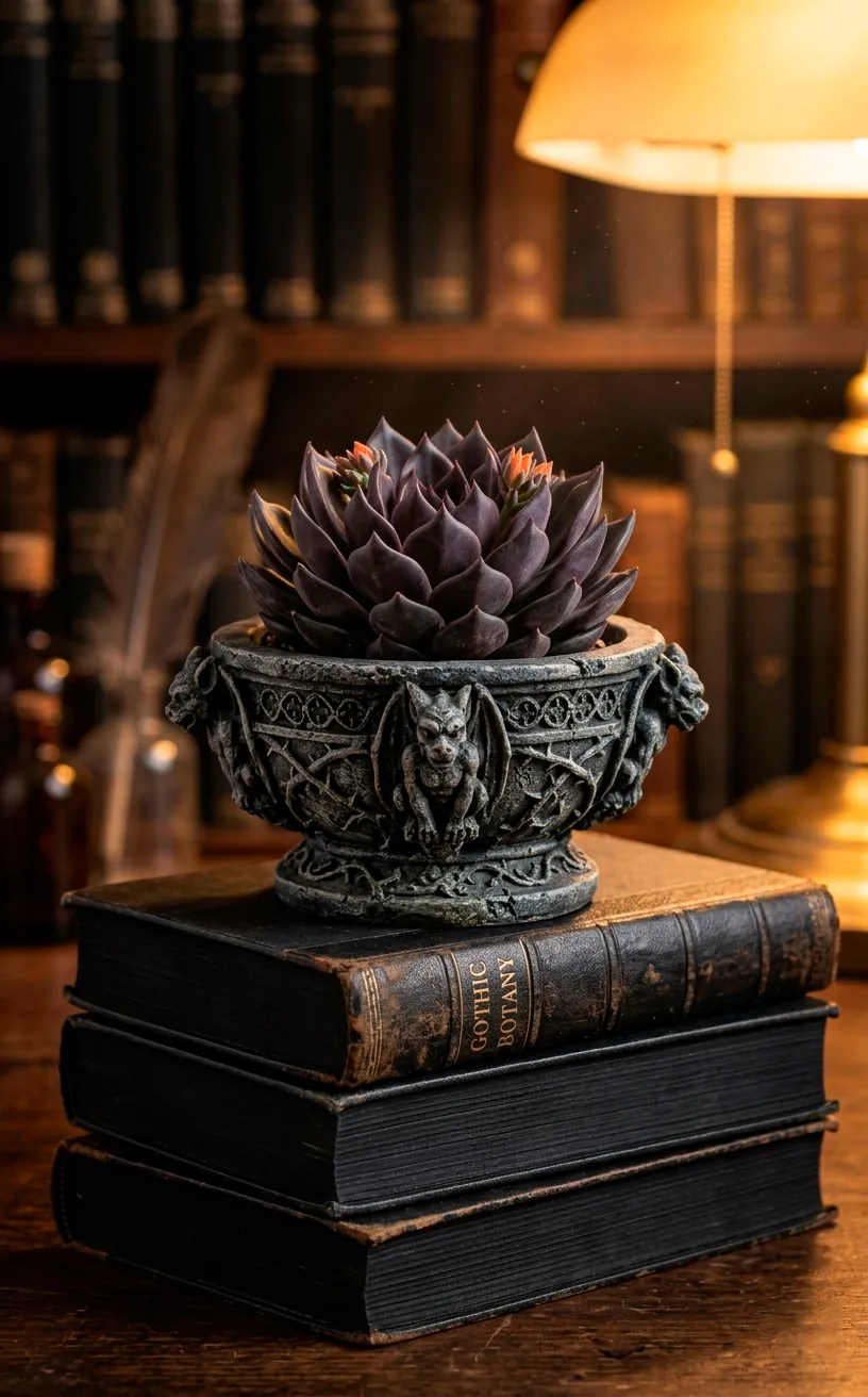 Who says succulents only belong in bright, airy kitchens? The Black Prince Echeveria proves that even desert plants can go through a phase. It forms a perfect rosette of dark purple-to-black leaves that look amazing in a stone bowl. I usually tuck these into the smaller gaps on my bookshelves where a trailing plant would be too much.