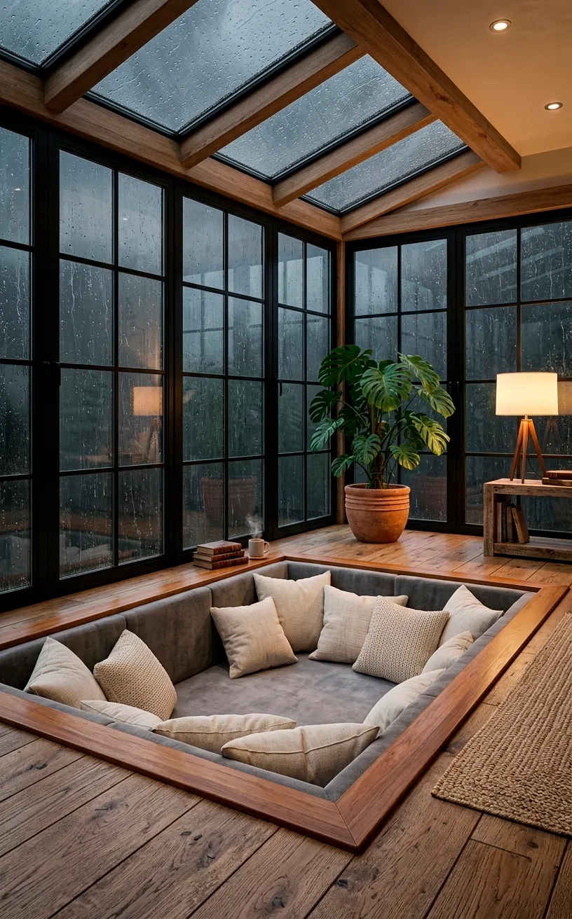 Ever felt like you’re a bit too “on display” in a sunroom with huge windows? A sunken seating area is a genius architectural trick. By dropping the floor level just a foot or two, you naturally hide behind the solid lower portion of your sunroom walls. It creates this incredibly cozy, den-like vibe that’s perfect for deep conversations or a solo nap.