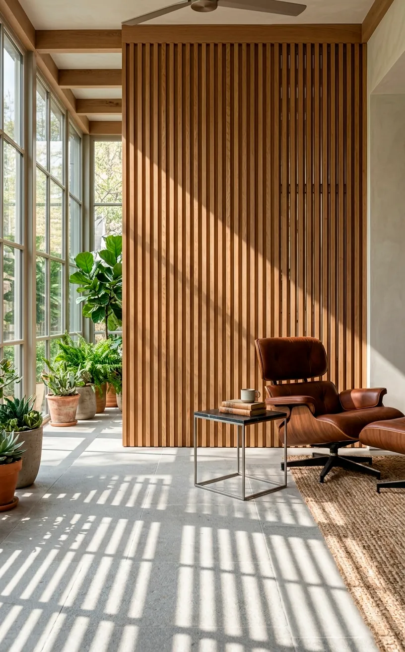 If you’re into that Scandi or Mid-Century Modern look, vertical wood slats are your best friend. They provide what I like to call “peek-a-boo” privacy. They let the light filter through while breaking up the line of sight from anyone passing by. It adds a beautiful, tactile layer to all that flat glass. You get that stunning linear shadow play throughout the day, which honestly looks amazing in photos. It’s sophisticated, sturdy, and makes the whole room look ten times more custom than it actually is. It’s the perfect way to hide a messy desk or a storage corner without blocking the sun. ☕