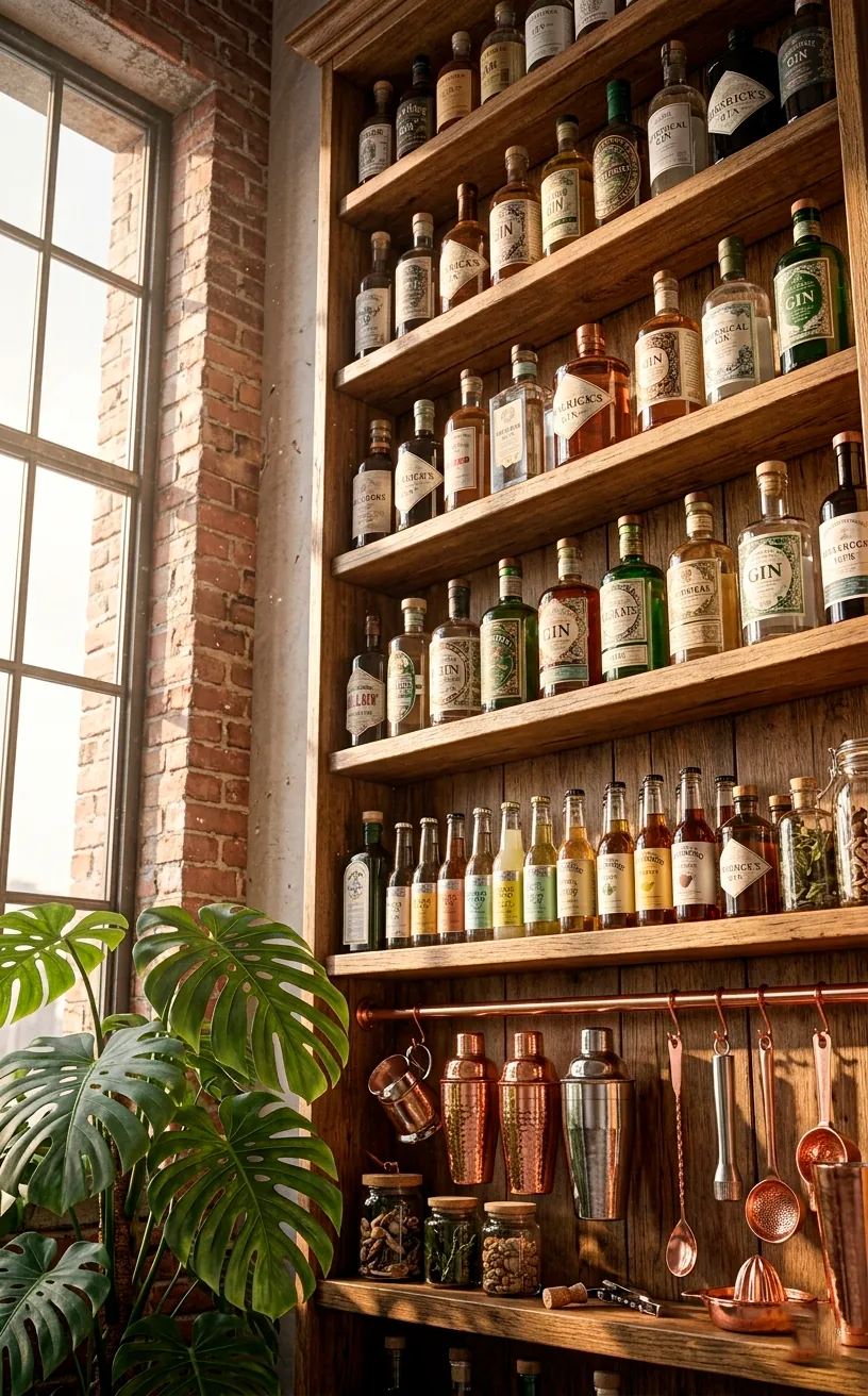 I personally love the look of thick, reclaimed wood planks mounted with heavy-duty iron brackets. It gives off that rugged, industrial-chic vibe without the footprint of a heavy cabinet. You’ll save your floor from looking cluttered, and your vacuum will finally thank you for not having to navigate a forest of table legs. Plus, guests always look up when they enter a room, making your vertical bar an instant focal point.