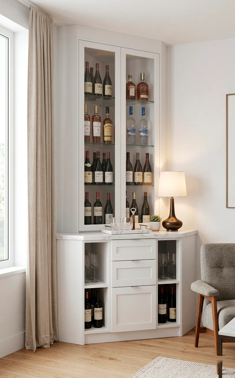Every home has that one weird, triangular corner that serves no purpose other than collecting dust bunnies. Ever wondered why we don’t use those for gin? Corner bar cabinets utilize the depth of these dead zones to provide surprisingly large storage capacities. You can tuck a whole speakeasy into a ninety-degree angle and still have room for your sofa. I find that a mirrored backing inside a corner unit works wonders because it reflects light and makes your bottle collection look twice as large. Who doesn’t want a perceived surplus of booze? Just make sure the unit matches your existing trim, or it might look like a random addition rather than a conscious design choice. It’s a total game-changer for cramped living rooms.