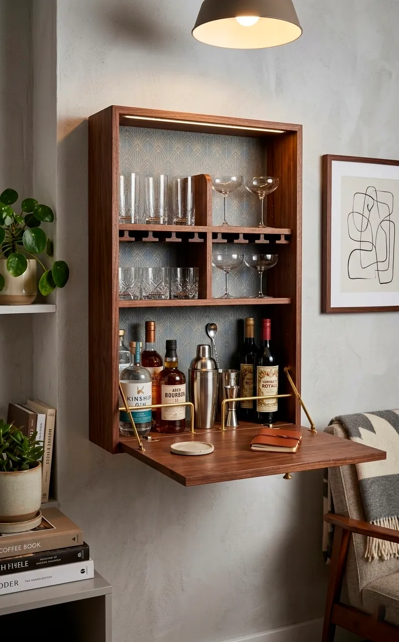 Wall-mounted fold-down desks have been around forever, so why not apply that genius to alcohol? A Murphy bar stays completely flush against the wall until you’re ready to celebrate. You pull down the front panel, and it instantly transforms into a sturdy mixing surface. It’s perfect for those who want to keep their “hobbies” out of sight during work-from-home hours.