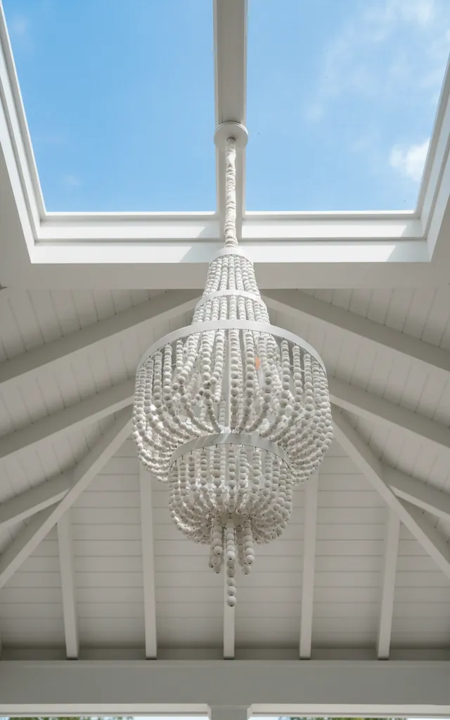 Ditch the standard ceiling fan and go for something with personality. I installed a beaded white chandelier that doubles as a piece of art during the day. At night, it casts a soft, warm glow that makes the white walls shimmer. Why settle for boring hardware when you can have a focal point that actually starts a conversation? Just ensure the fixture handles damp environments, or you’ll have a very expensive, very broken ceiling ornament.