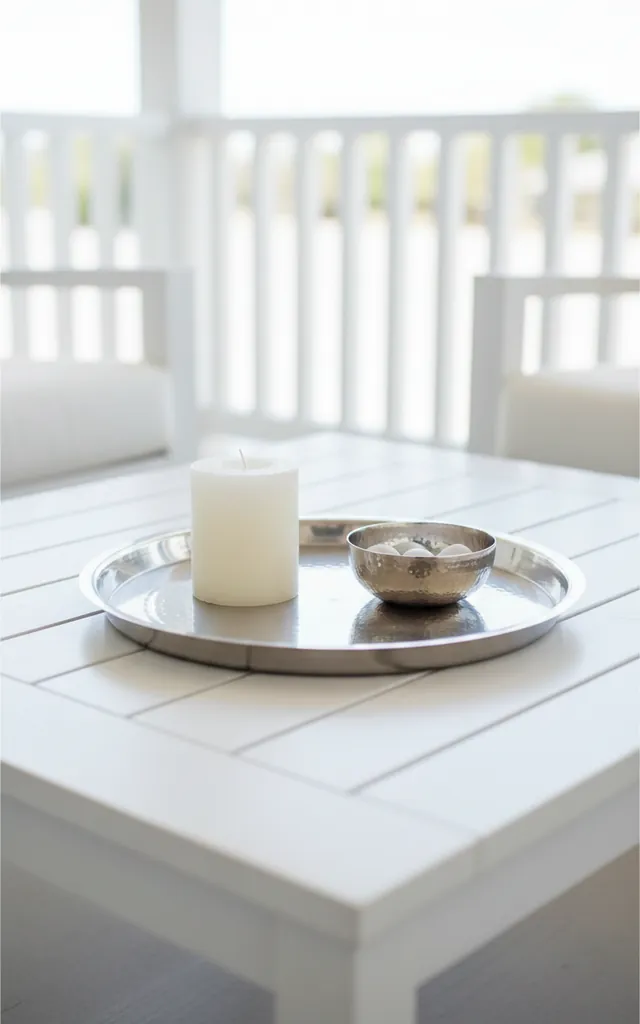 A few silver or gold accents can make an all-white space feel expensive. I keep a few metallic lanterns and a tray on the coffee table to catch the sun. It adds just enough shimmer to break up the monochrome without ruining the airy feel. Just a touch of glam goes a long way in an outdoor space, don’t you think? It’s like adding a pair of diamond earrings to a plain white tee—suddenly, you’re fancy.