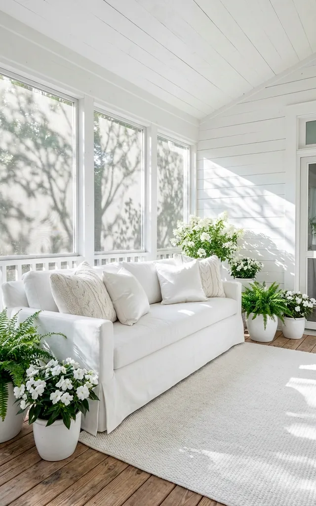 All-white decor needs a little life to keep it from looking flat. I love tucking oversized ferns and potted palms into the corners of my porch. The vibrant green pops against the white backdrop like nothing else. It’s the easiest way to bring that jungle chic aesthetic home without the humidity. Doesn’t the contrast just make the white look even crispier? I find that organic shapes help break up the straight lines of the porch screens beautifully.