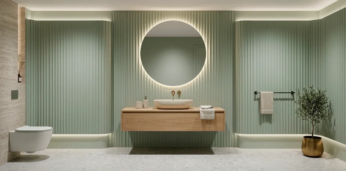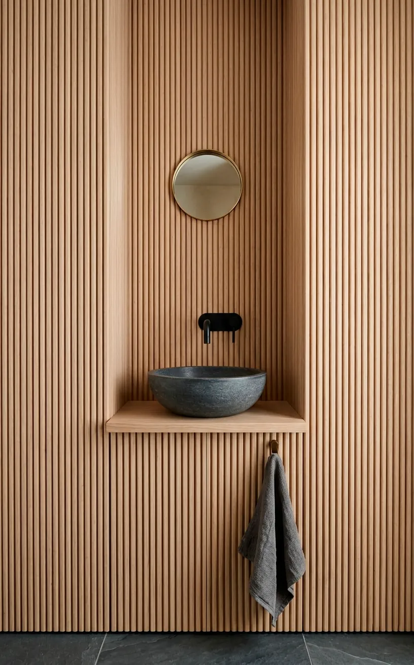 It is the “quiet luxury” of bathroom design. Combine a stone sink with a wooden slat wall for a balanced, organic feel. This approach keeps the room feeling fresh and clean while avoiding that sterile, hospital-like atmosphere we all dread.
