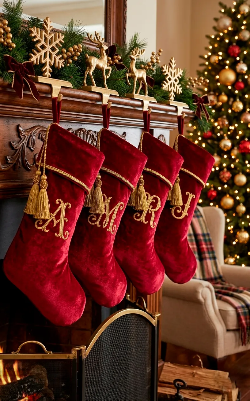 You should use heavy, weighted gold stocking holders instead of nails. It looks way more professional and saves your woodwork from looking like Swiss cheese. I find that a mix of different gold textures—like polished brass and brushed gold—adds a lot of depth to the arrangement. Is there anything more satisfying than seeing your name stitched in elegant gold script? IMO, it’s the ultimate way to claim your territory on Christmas morning. 🎅