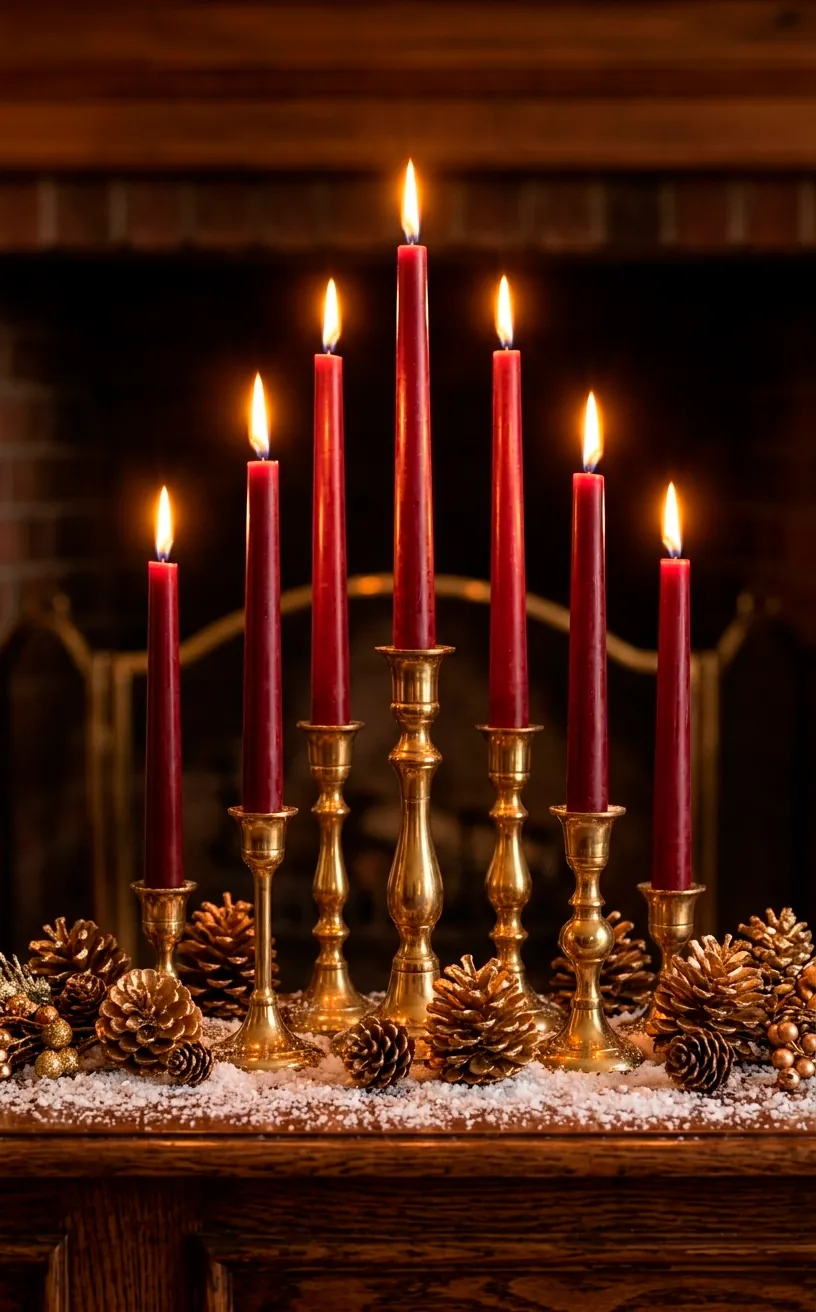 Group them in clusters of three or five on one side of the mantle to create an asymmetrical, modern twist on a traditional look. Just make sure you keep the flame away from the garland, or your ‘cozy’ night might turn into an unscheduled visit from the fire department. I’ve seen it happen, and trust me, soot is not a cute holiday accessory. The warm gold of the brass combined with the red wax is the ultimate color pairing for a cold winter night. It just feels… right, you know?