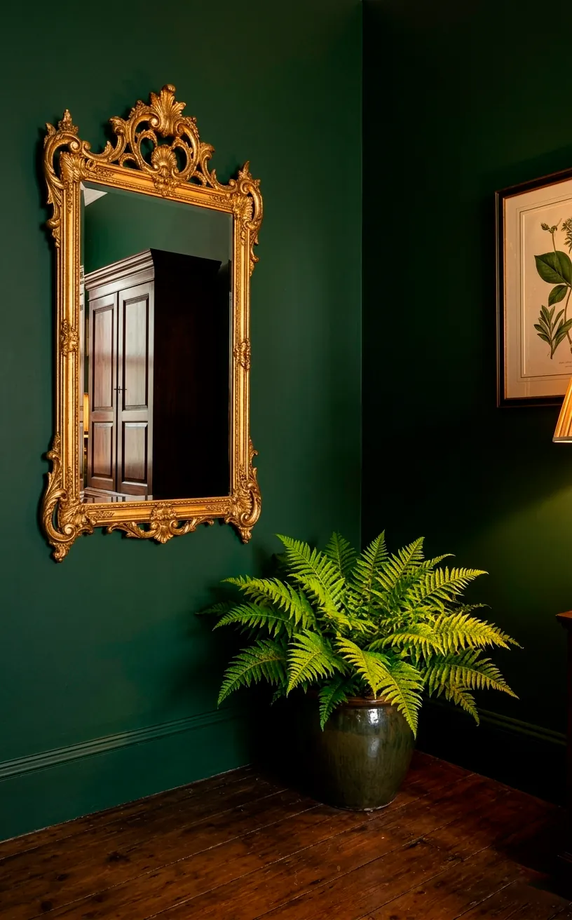 Plants are essential, but keep them moody. Ferns and ivy fit the vibe better than bright succulents. I also love mixing in dried eucalyptus or pressed flowers in gold frames. It bridges the gap between the vintage wood and the floral patterns perfectly. It brings the garden inside, even if it’s a dormant one.