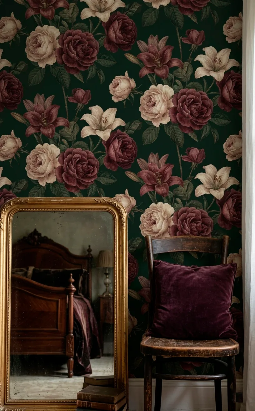 Forget grandmother’s bright pink roses. We want florals that look like they grew in the moonlight. Think deep plums, forest greens, and charcoal backgrounds. I personally think wallpaper is the way to go here. It changes the entire vibe instantly and adds a layer of sophisticated gloom.