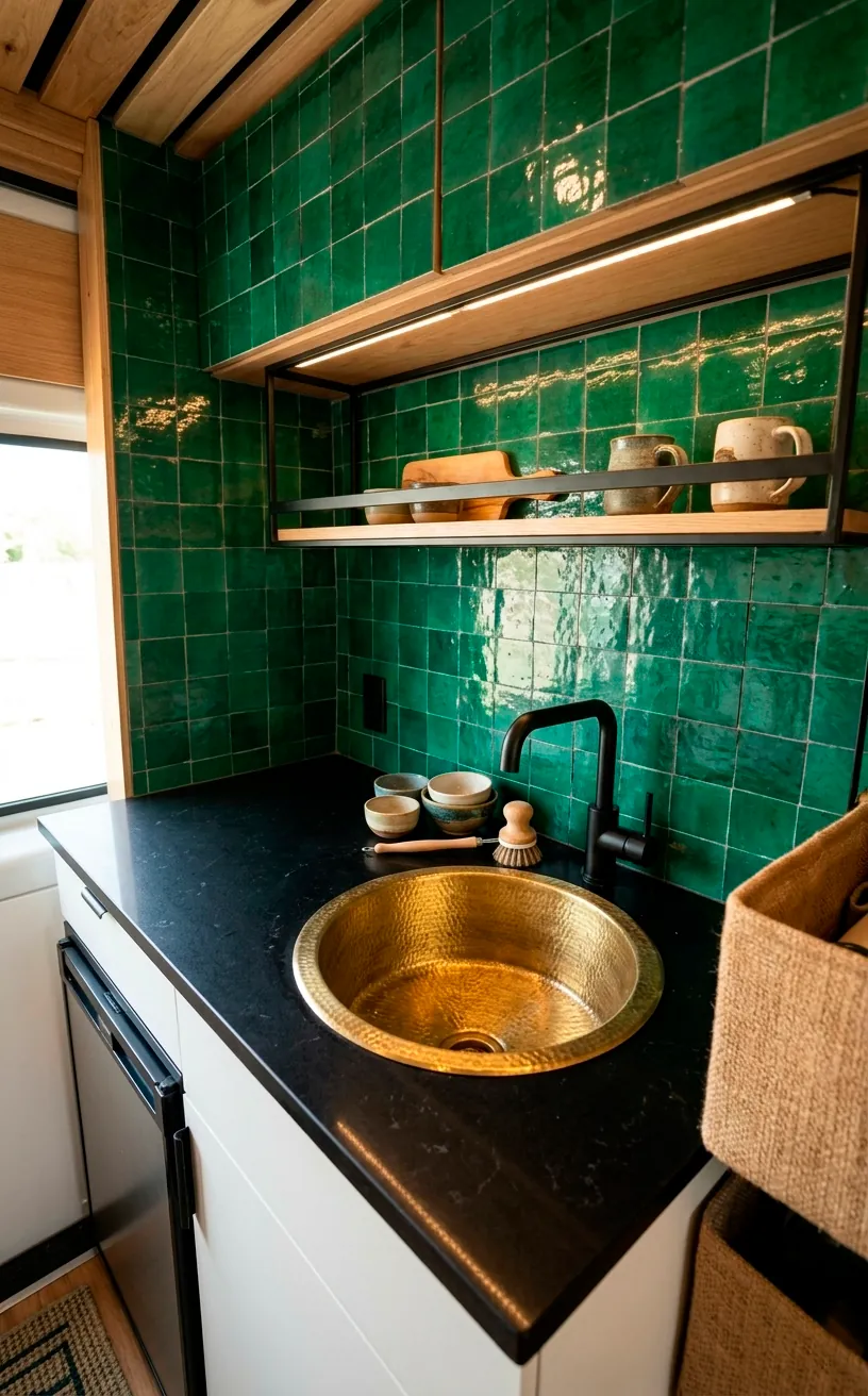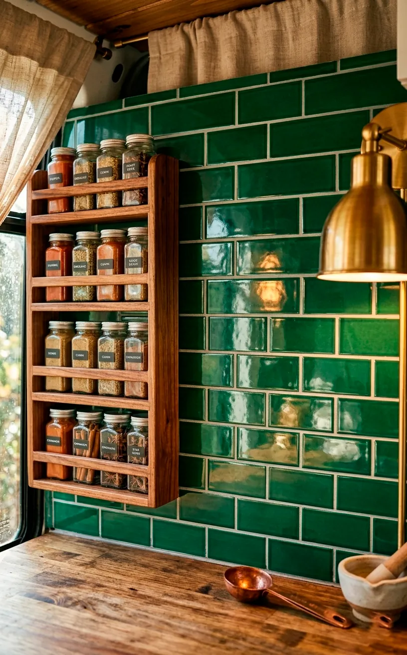 If you want a splash of color that isn’t overwhelming, the backsplash is your best friend. I love using emerald green subway tiles with a high-gloss finish to reflect light around the small space. Since weight is always a concern in a van, you can use clever peel-and-stick versions that look exactly like the real thing without the heavy grout. It creates a seamless transition between your countertop and upper cabinets. This bold green hue anchors the kitchen and makes the brass hardware sing. FYI, a darker backsplash is much easier to keep looking clean when you’re cooking in the wild. No more staring at grease splatters on white paint! It is practical, stylish, and honestly, a total game-changer for the overall ‘luxe’ feel of your home on wheels. 🚐