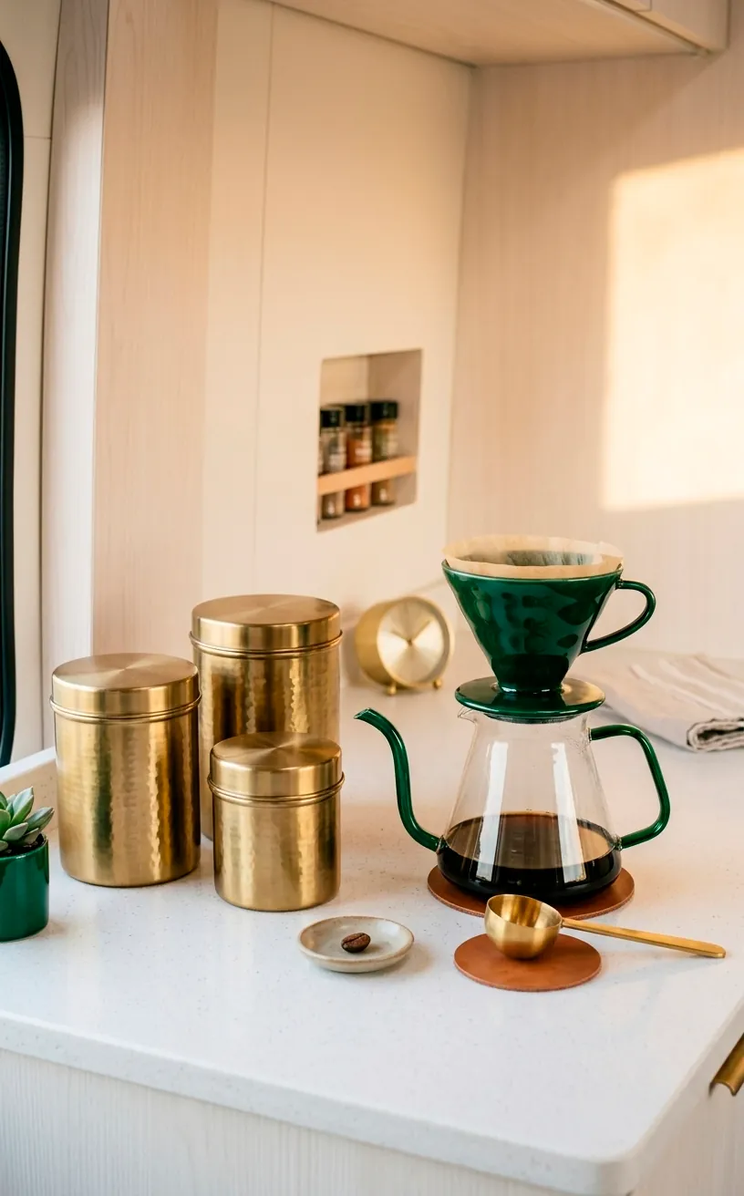 I keep a set of brushed brass canisters on my counter for coffee and tea. They don’t just store your essentials; they act as decorative accents that tie the whole emerald theme together.