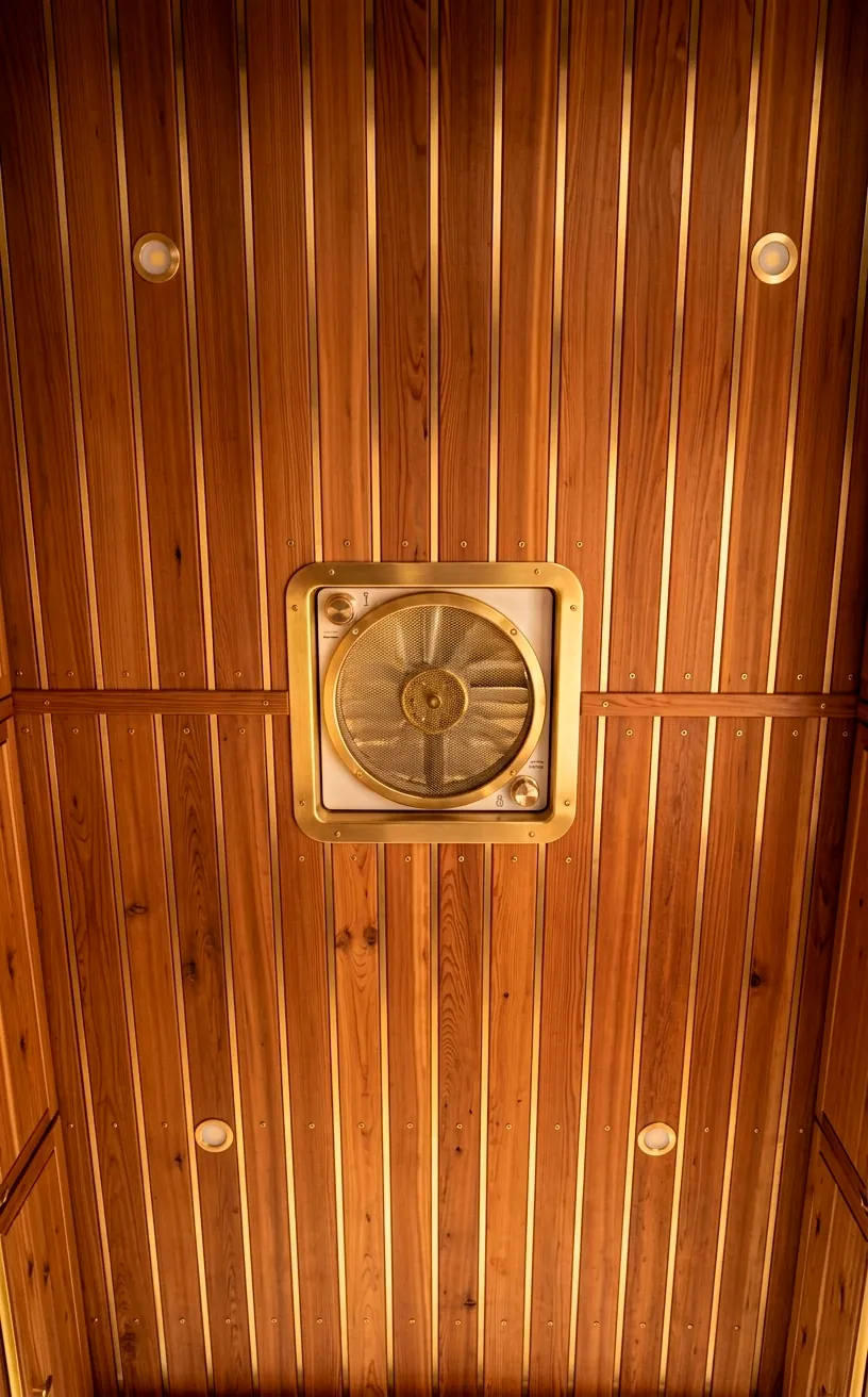 Most people forget the ceiling, but I think it’s the perfect place for a secret pop of luxury. I used thin brass inlay strips between my cedar ceiling planks to create a high-end pinstripe effect. It draws the eye upward and makes the van feel significantly taller than it actually is.