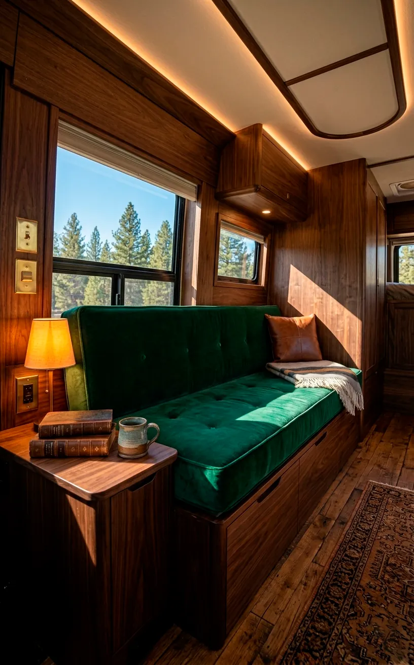 Luxury camper van interior with deep emerald green velvet seating and brushed brass lighting accents in a forest setting.