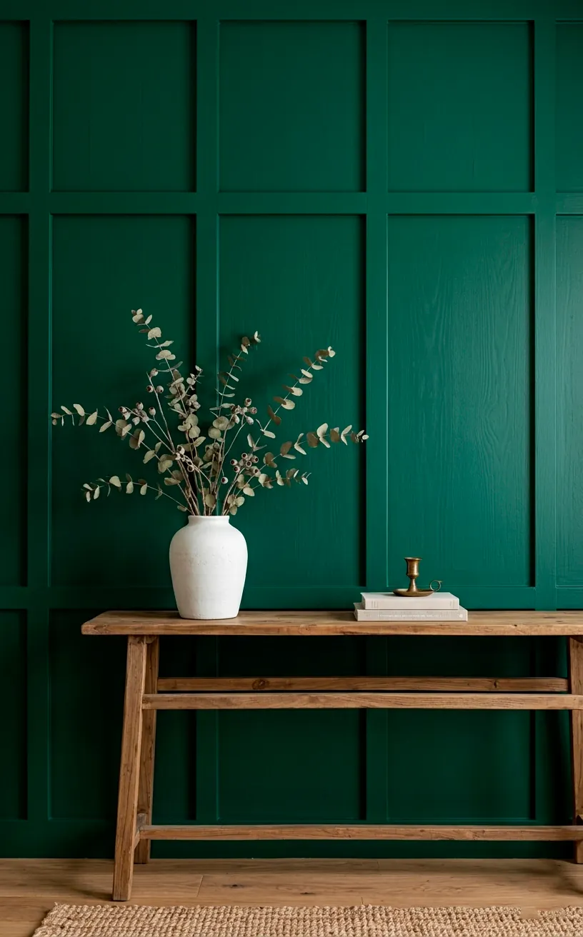 Maybe you aren’t ready to commit to a four-figure sofa? No problem. A textured emerald accent wall does the heavy lifting for you. I’m talking wainscoting, board and batten, or even a dark floral wallpaper. It adds depth that flat paint simply can’t touch.