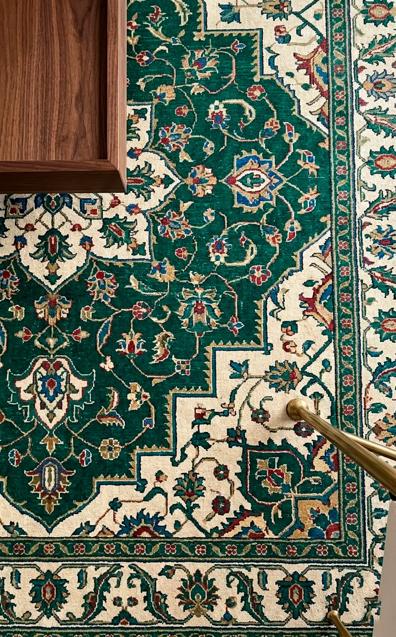 A rug is the glue that holds your design together. An oriental rug with emerald tones brings in history and pattern without being too loud. I once tried a bright green shag rug and it looked like a mini golf course—don’t do that. Stick to traditional patterns or deep solid piles to keep it luxe.