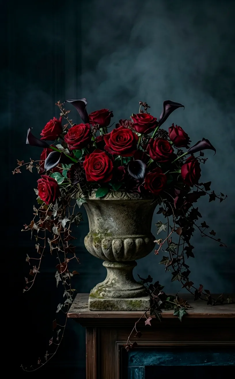 In a Gothic setup, you want dried florals or deep, bruised-looking colors. Think dried eucalyptus, dead-looking roses, or deep burgundy peonies. I usually grab a heavy stone or pewter urn to house these. It adds a sense of weight and history that glass vases just can’t touch.