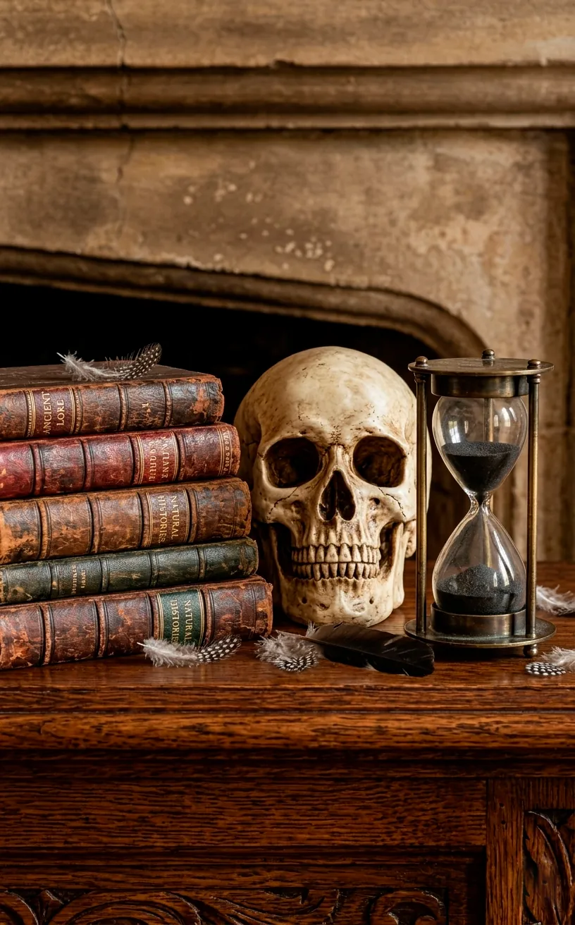 I suggest adding oddities and vintage finds. A brass hourglass, a weathered skull, or a stack of old leather-bound books adds layers of storytelling to your mantle. Why have a generic shelf when you can have a curated museum of the macabre?