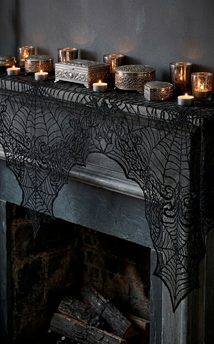 You should let the fabric hang unevenly. A perfectly straight runner looks too formal and stiff. Let the lace drape over the corners to break up the horizontal lines of the mantle. This adds movement and a touch of elegance that balances out the darker elements like skulls or dead flowers. It’s the perfect way to finish the look.