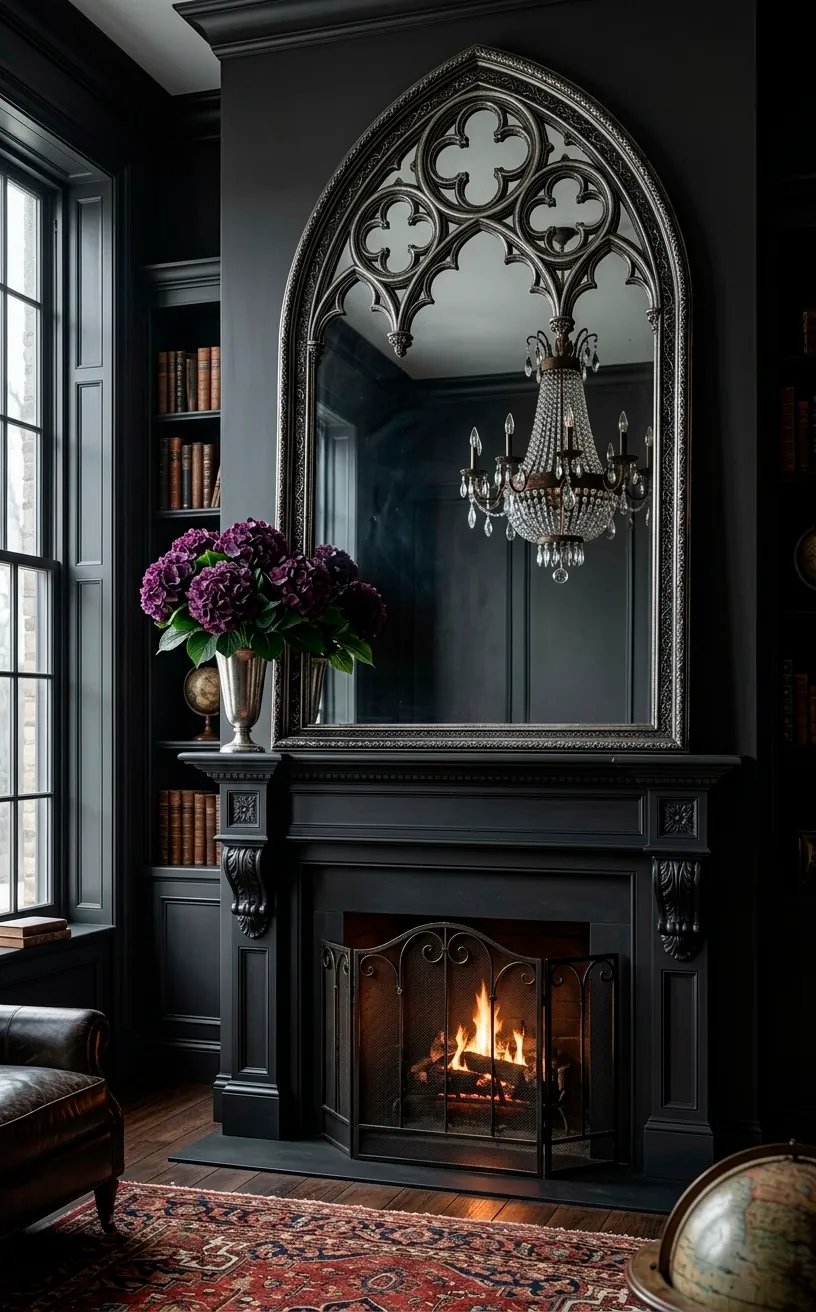 Every dramatic mantle starts with a massive, eye-catching anchor. I personally swear by an oversized, arched Gothic mirror or a piece of dark, moody oil painting to set the stage. Why settle for a tiny frame that disappears against the wall? A tall, ornate mirror creates height and reflects the flickering candlelight you’ll add later, making the whole room feel more mysterious.
