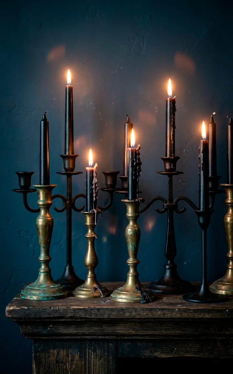 Forget your ceiling lights; you want shadows that dance. A Gothic mantle thrives on asymmetrical lighting using varied heights of candle holders. I love using tarnished brass or matte black iron pillars to hold thick, dripping taper candles. Ever noticed how much cooler black candles look compared to basic white? They scream drama. FYI, stagger your heights to avoid looking too symmetrical and boring. You want the light to hit the wall at different levels, creating those long, eerie shadows that define the Gothic aesthetic. Use at least five different holders to create a cluster that feels organic and collected over time.