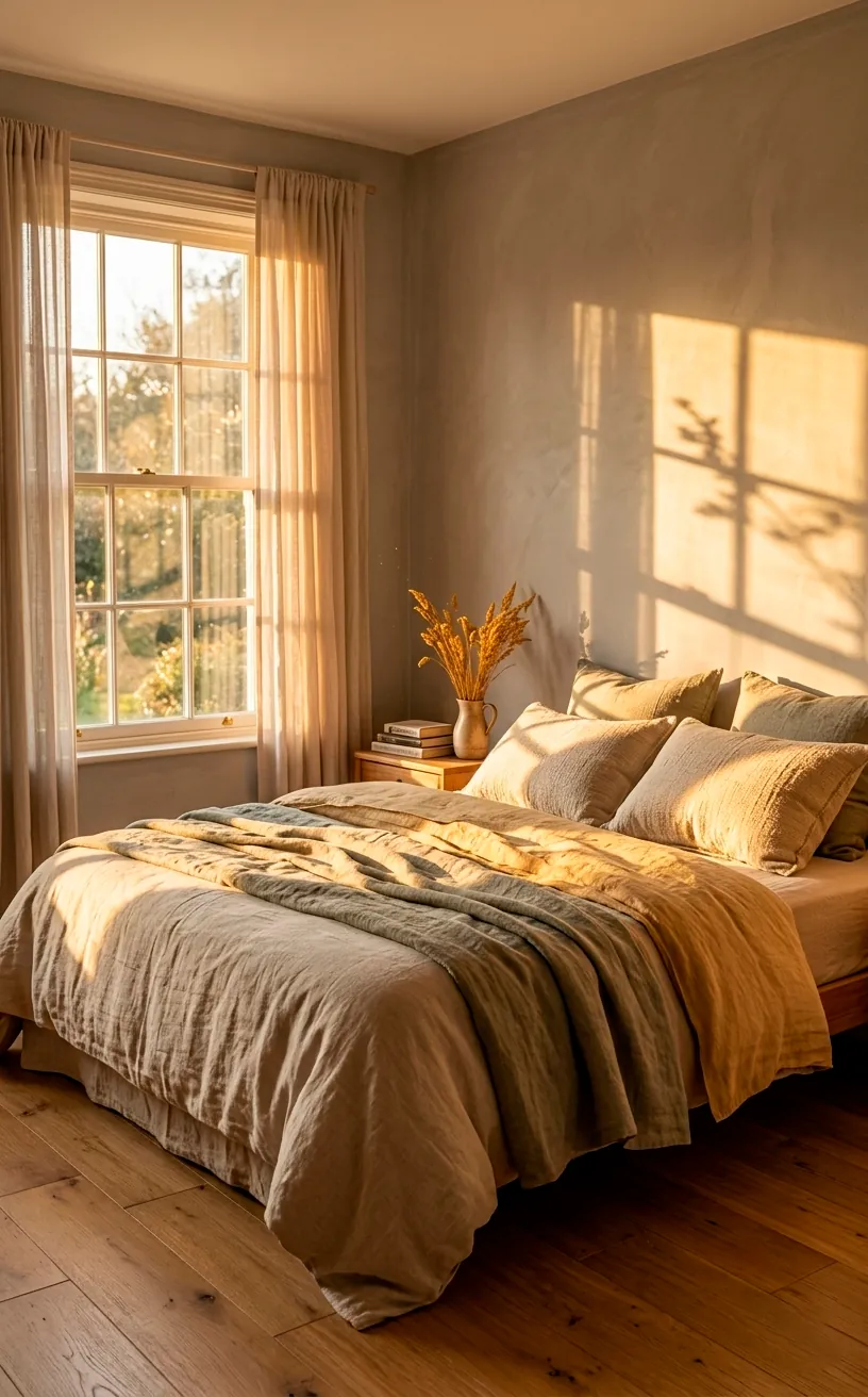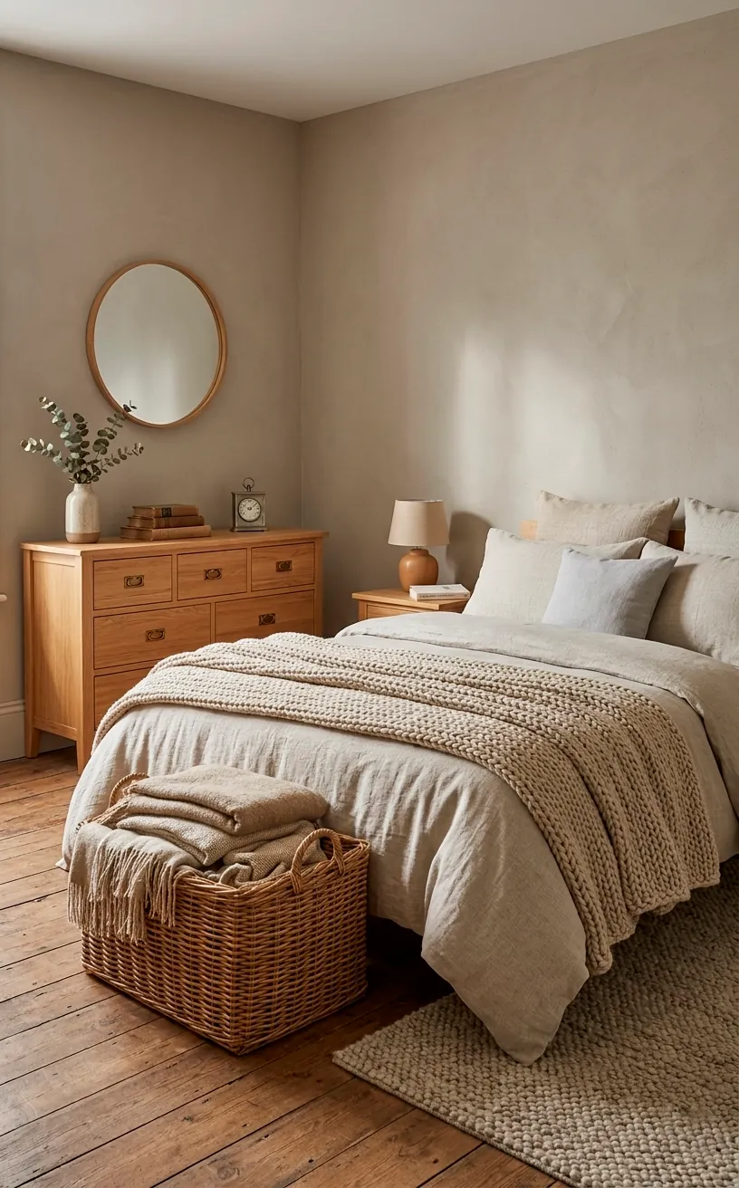 Greige works beautifully with natural materials. Think light oak flooring, rattan baskets, and chunky wool blankets. Does anything beat that organic, earthy feeling in a sleeping space? IMO, it’s the ultimate hack for making a new build feel like it actually has a soul.