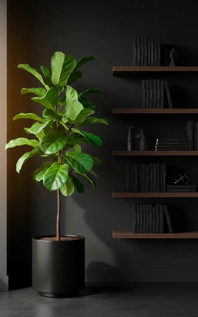 You do not want your house to look like a literal void, right? Bringing in organic elements like deep walnut wood or oversized tropical plants breathes life into the space. I love how a giant Fiddle Leaf Fig looks against a charcoal wall—the green practically glows! It keeps the home feeling like a home and not a museum.