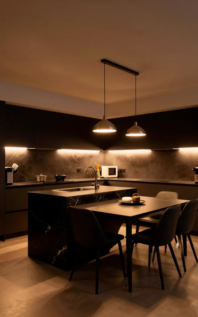 - Under-cabinet lighting adds essential depth to dark kitchens.