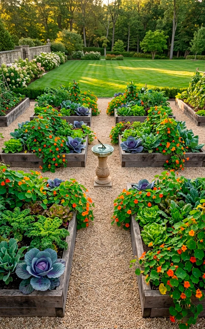 If you want your backyard to look like a scene from a moody period drama, the French Potager is your go-to. This layout treats vegetables like art, mixing edible greens with ornamental flowers in geometric patterns. You don’t just shove seeds in the dirt here; you create a tapestry. I love how this design keeps the garden looking polished even when the zucchini starts taking over the world. By surrounding your heirloom kale with marigolds and lavender, you confuse the pests and delight your neighbors. Why choose between a pretty yard and a full fridge when you can have both? It’s the ultimate flex for the aesthetic gardener. Symmetry and structure define this layout, making every harvest feel like a high-end shopping trip in your own backyard.