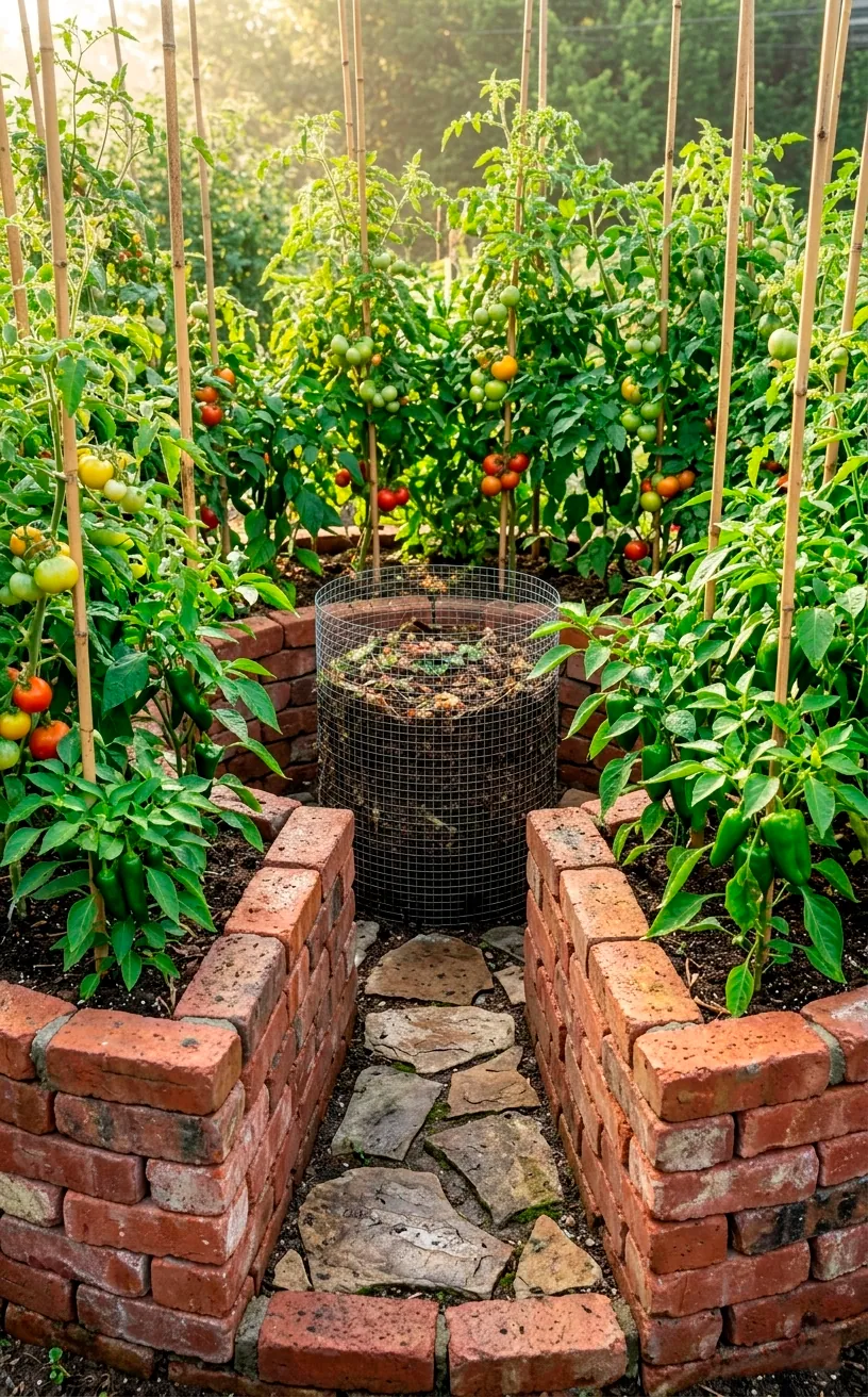 This layout is a total game-changer for dry climates or anyone who values efficiency over tradition. The central compost basket slowly releases nutrients and moisture directly into the surrounding soil. It’s basically a self-feeding machine for your heirloom peppers and tomatoes.